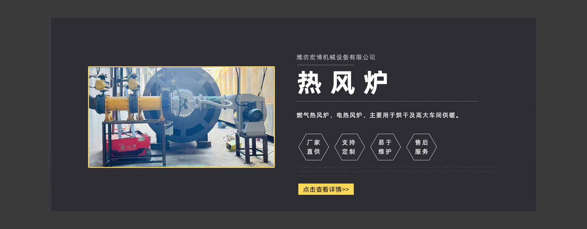 濰坊宏博機(jī)(jī)械設(shè)(shè)備有限公司是從事熱風(fēng)(fēng)爐、烘干設(shè)(shè)備、供暖設(shè)(shè)備的研發(fā)(fā)、設(shè)(shè)計(jì)(jì)、制造和服務(wù)(wù)于一體的實(shí)(shí)體企業(yè)(yè)。長(zhǎng)期以來,企業(yè)(yè)以市場(chǎng)(chǎng)的發(fā)(fā)展和客戶的需求為導(dǎo)(dǎo)向,集多年的生產(chǎn)(chǎn)技術(shù)(shù)與經(jīng)(jīng)驗(yàn)(yàn)為一體,不斷開發(fā)(fā)和優(yōu)(yōu)良產(chǎn)(chǎn)品。